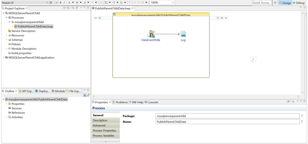 mssqlserverparentchild. PublishParentChildData process. This project demonstrates how the plug-in handles polling of data from the publishing table. The corresponding data from the child table is also fetched.