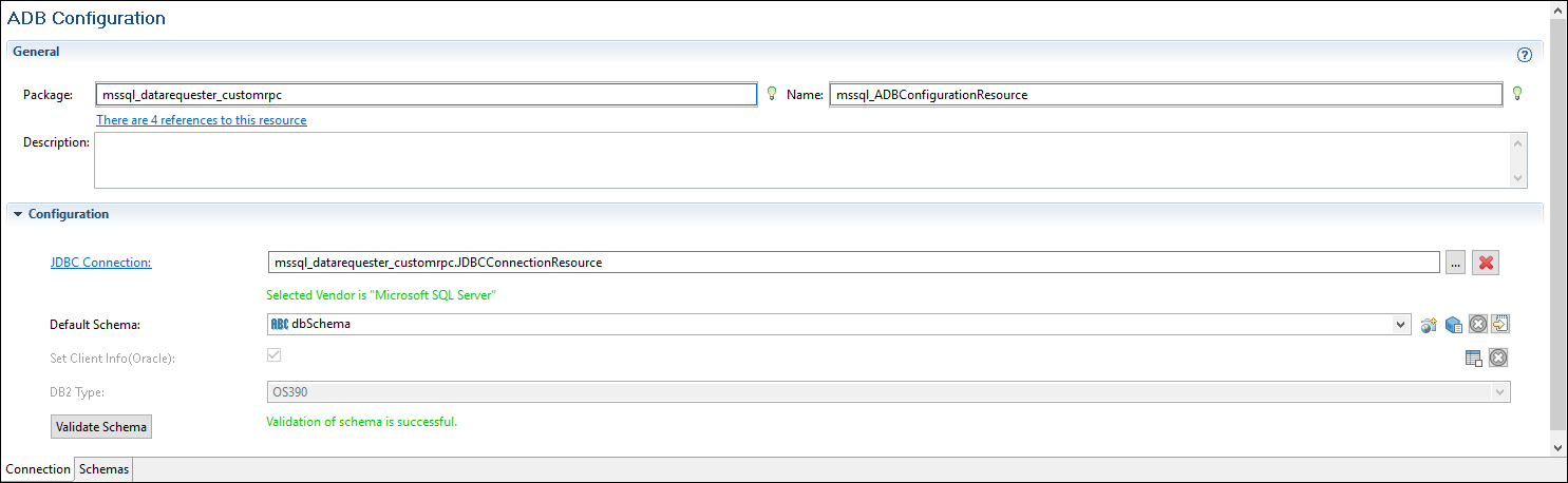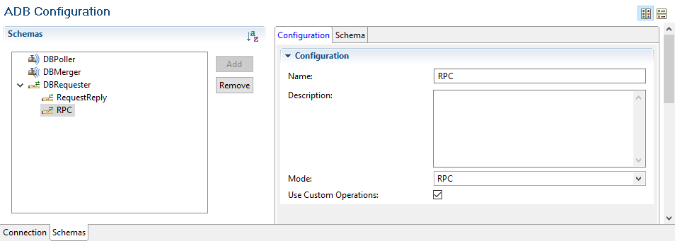 The Configuration tab is used to configure the schema. In the following figure, RPC mode with custom operations has been selected.