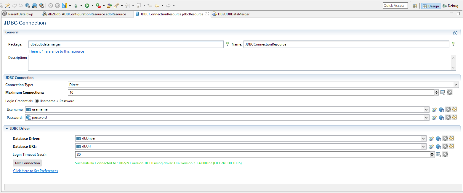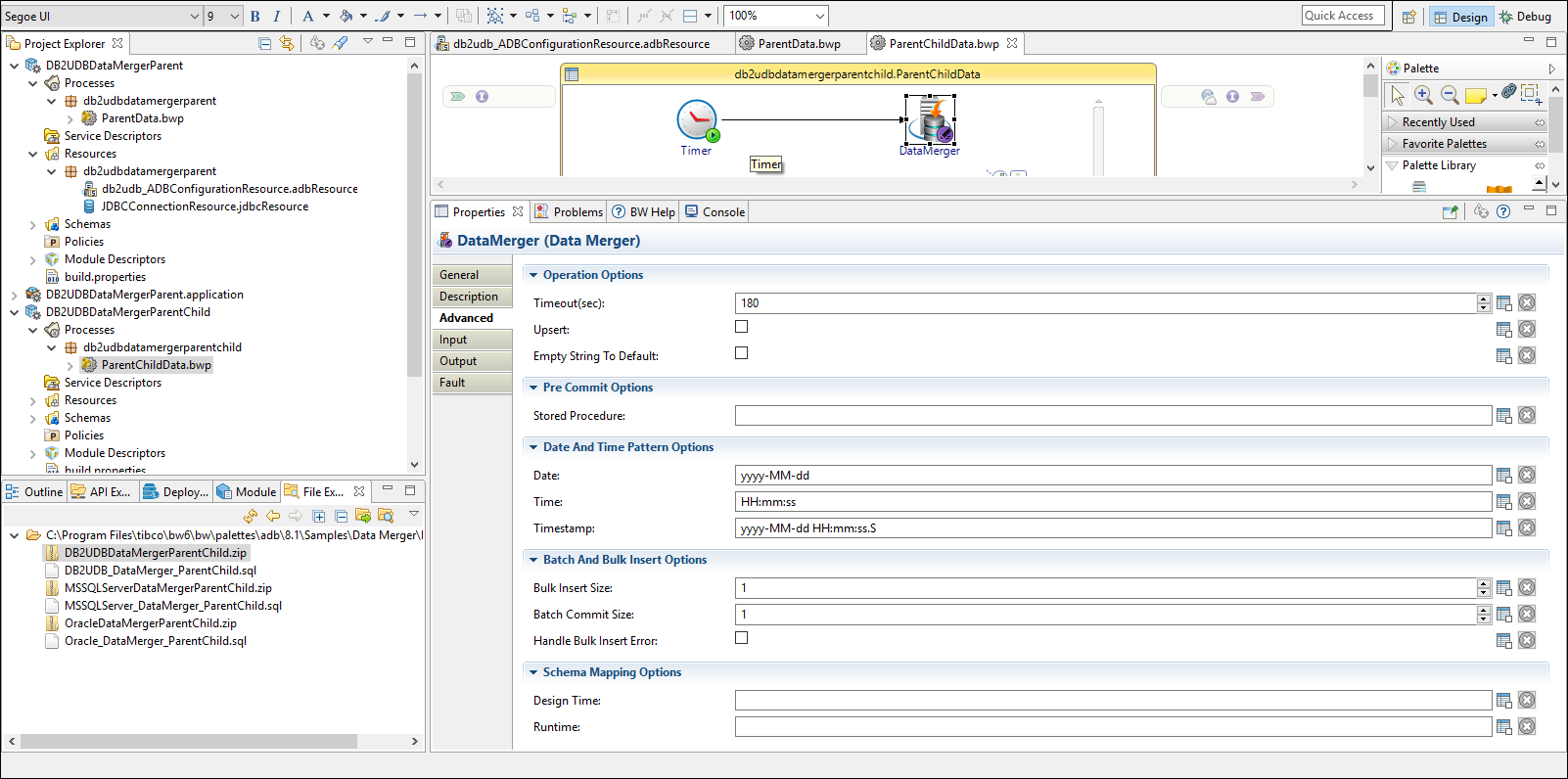 The DB2UDBDataMergerParentChild project contains one process: db2udbdatamergerparentchild.ParentChildData process. This process demonstrates how the plug-in inserts data in the parent table and the child table.
