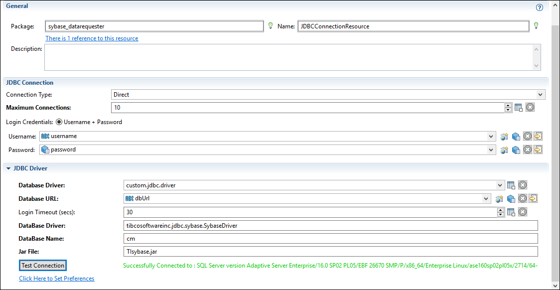 For more information about configuring a custom JDBC driver for Sybase, see "Configuring Sybase Database by Using Custom JDBC Driver" in TIBCO ActiveMatrix BusinessWorks™ Plug-in for Database User's Guide.