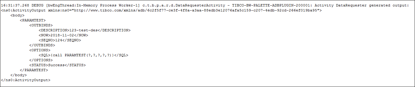 After the Execute_procedure_PARAMTEST process runs successfully, its input and output can be seen as follows:
