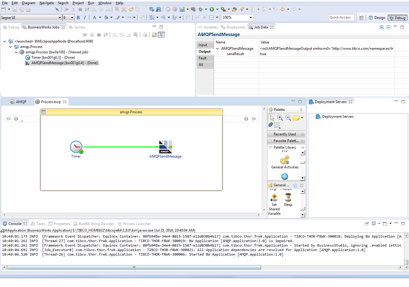 TIBCO Business Studio for BusinessWorks changes to the Debug perspective. The debug information is displayed in the Console view.