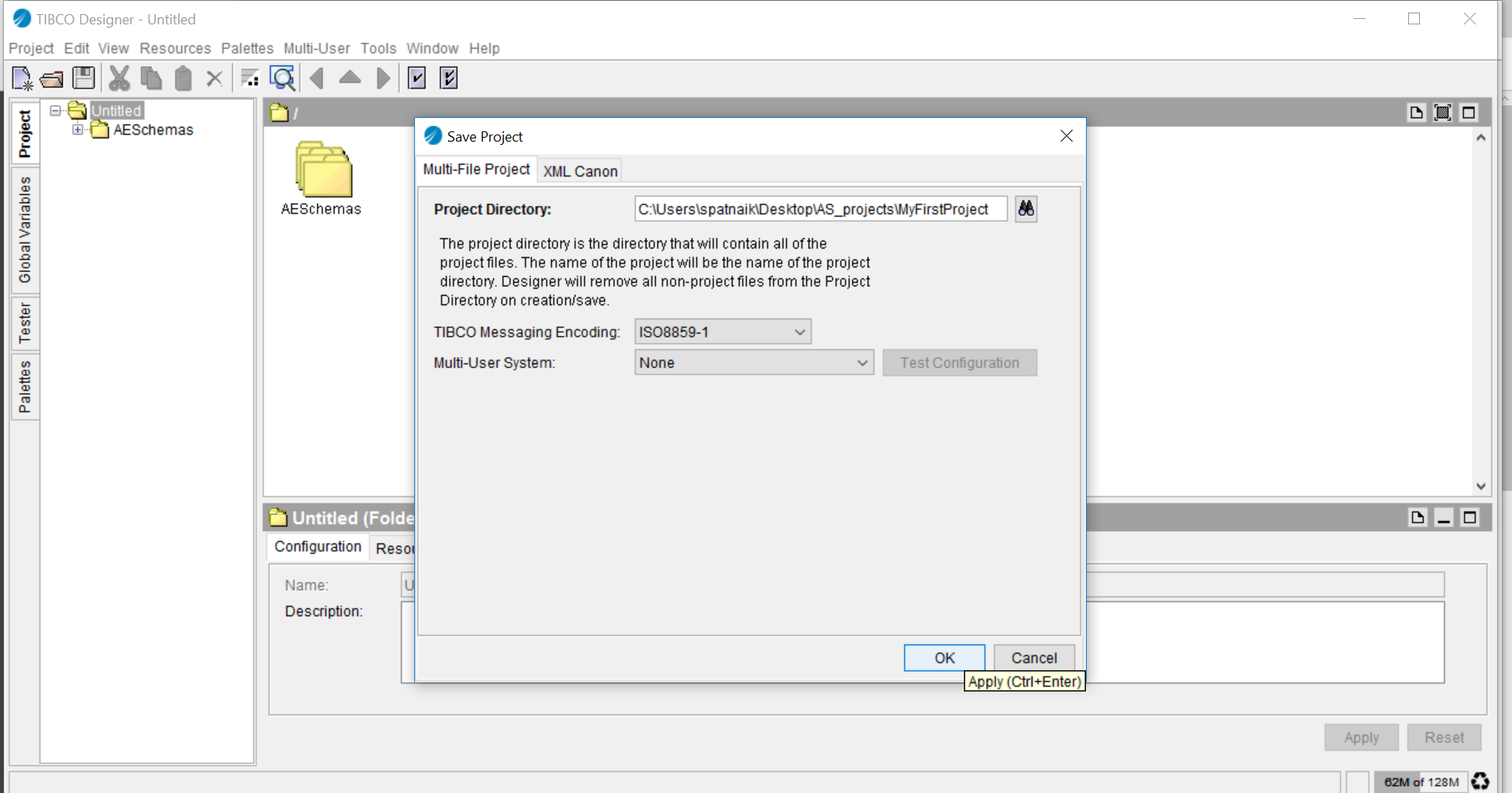 TIBCO Designer window opens with the new empty project.