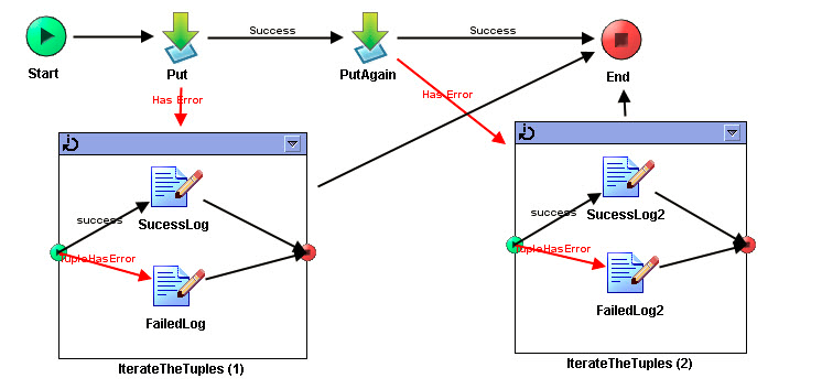 Note: If an error occurs during the PutAgain operation, the IterateTheTuples(2) group iterates over every result parameter in the output of the PutAgain activity.