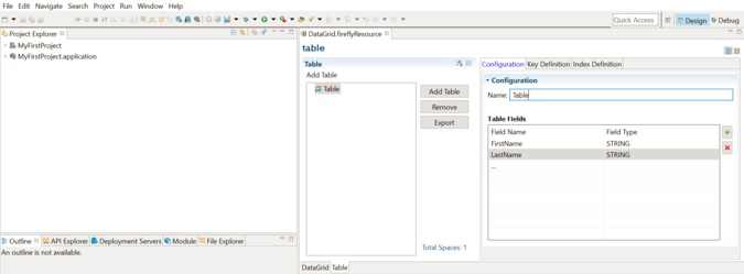 A Table shared resource represents a table. The Table shared resource is embedded in the DataGrid shared resource. To use the ActiveSpaces DataGrid activities, you must create a DataGrid connection and then add a table to the DataGrid.