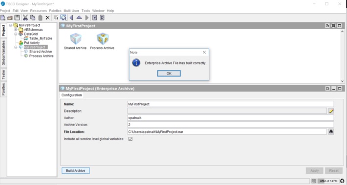 Build Archive under the Enterprise Archive panel to build the archive. When you click the button, TIBCO Designer generates an EAR file that you can deploy from TIBCO Administrator.
