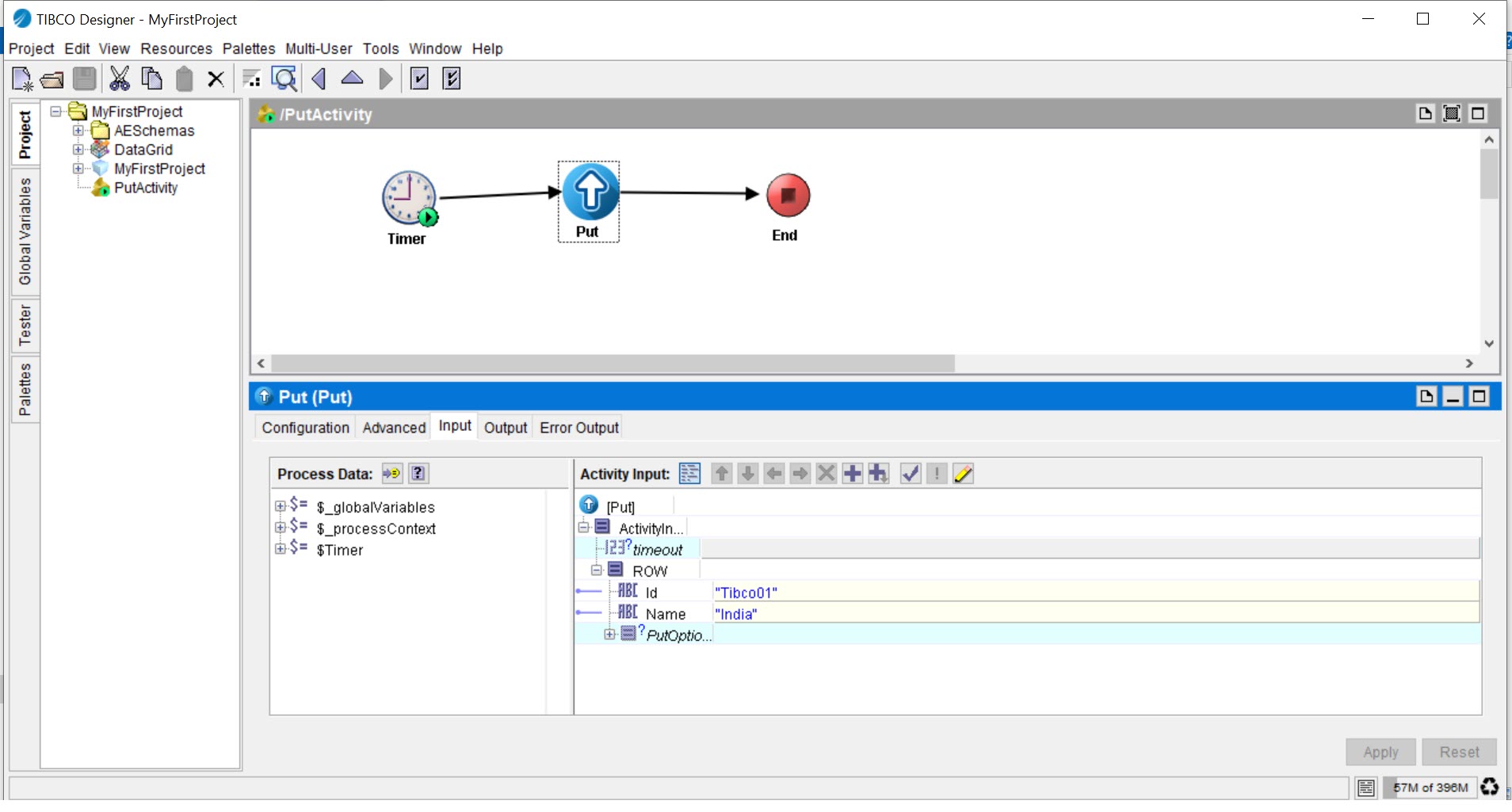 You must create a datagrid connection as described in Creating a DataGrid Connection and add a table as described in Adding a Table. You should have an empty process in the project you created.