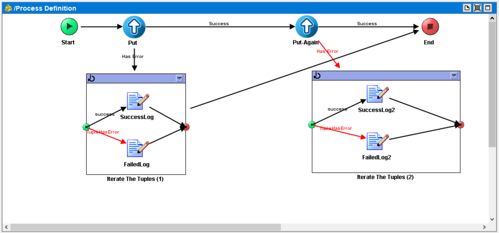 Note: If an error occurs during the PutAgain operation, the IterateTheTuples(2) group iterates over every result parameter in the output of the PutAgain activity.