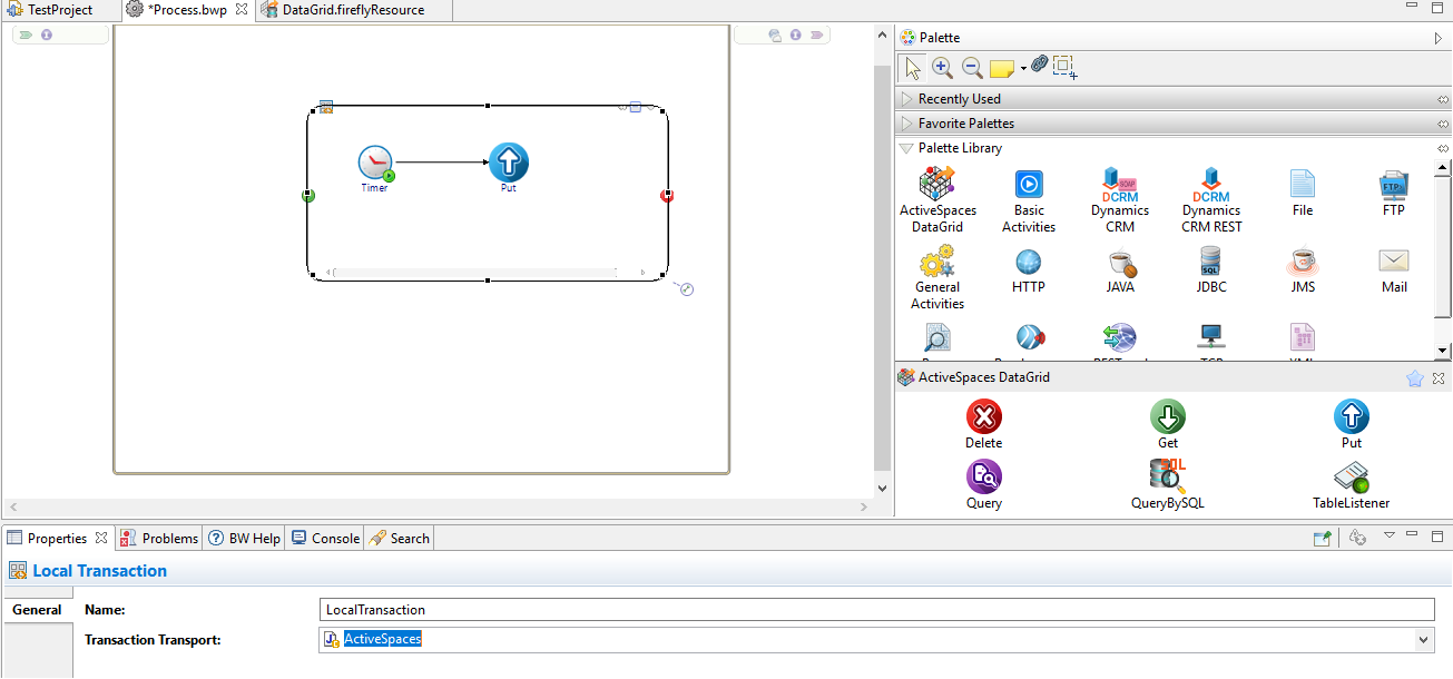 The ActiveSpaces DataGrid palette supports multiple activities to be part of a local transaction using the Local Transaction group of ActiveMatrix BusinessWorks™.