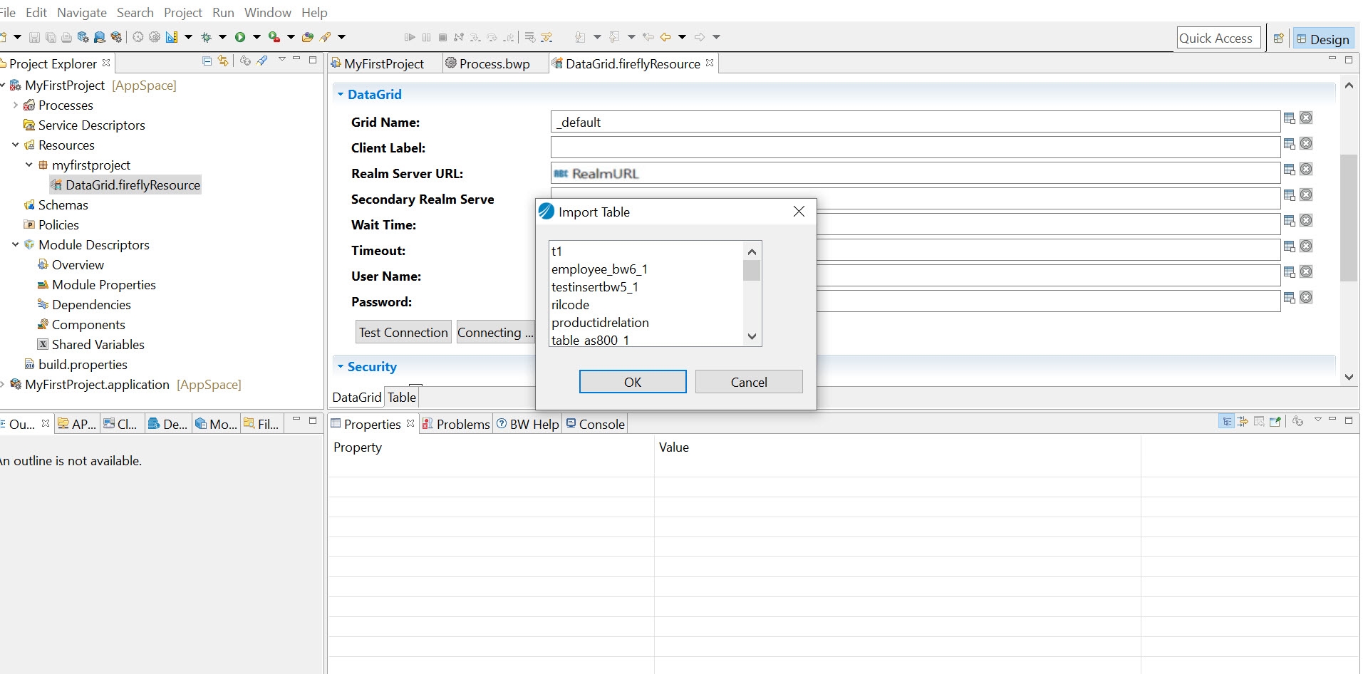 Before you begin You must create a DataGrid connection as described in Creating a DataGrid Connection and add a table as described in Adding a Table . Also, ensure that the ActiveSpaces RealmServer is started and the DataGrid shared resource connection is tested.