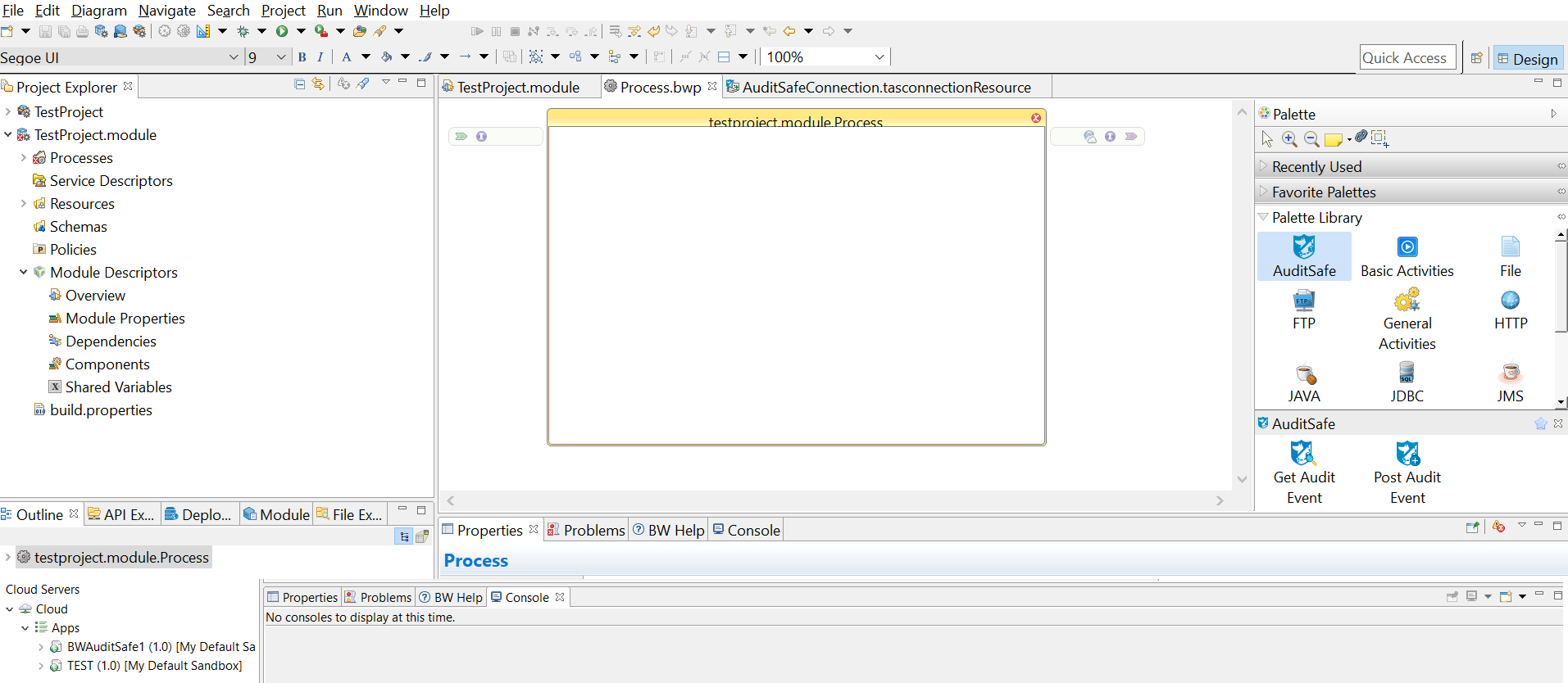 A project and an application are created and displayed in the Project Explorer view. The Process editor opens automatically.