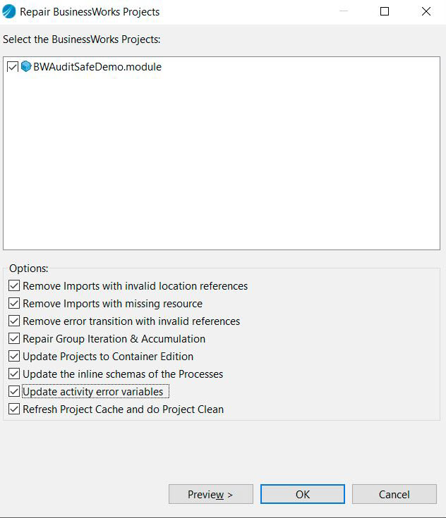 - Right-click BWAuditSafeDemo.module in the Project Explorer view, and then click Refactor > Repair BusinessWorks Projects