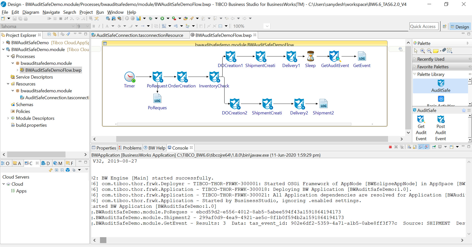 - After successfully connecting to the TIBCO AuditSafe server, expand Processes > bwauditsafedemo.module.