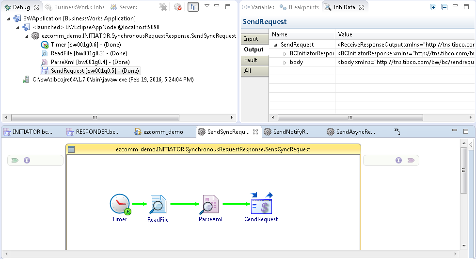 TIBCO Business Studio changes to the Debug perspective. The debug information is displayed in the Console view.