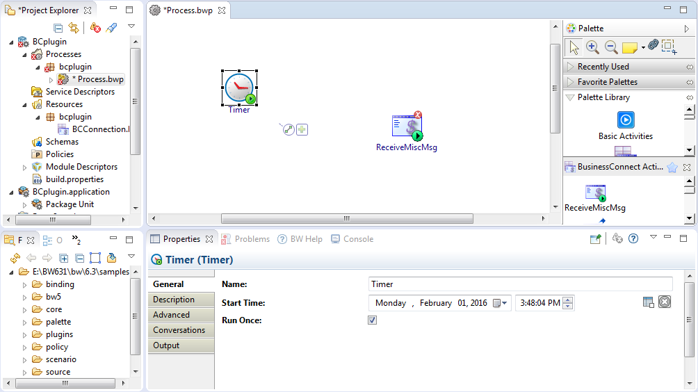 For example, select and drop the Timer activity from the General Activities palette and the ReceiveMiscMsg activity from the BusinessConnect Activities palette.