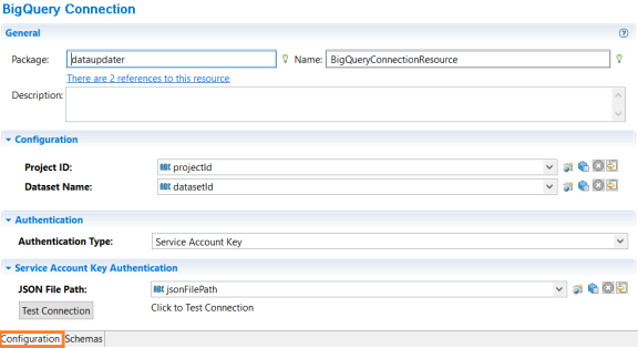 The BigQuery Connection shared resource is created. The shared resource consists of two tabs: Configuration and Schema.
