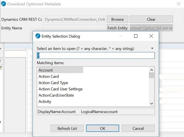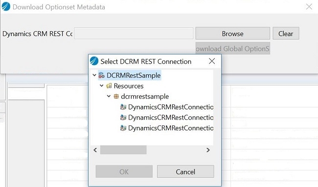 - In the Download Optionset Metadata dialog box, click Browse to select the Dynamics CRM REST Connection resource for which we need to download the option set metadata.
