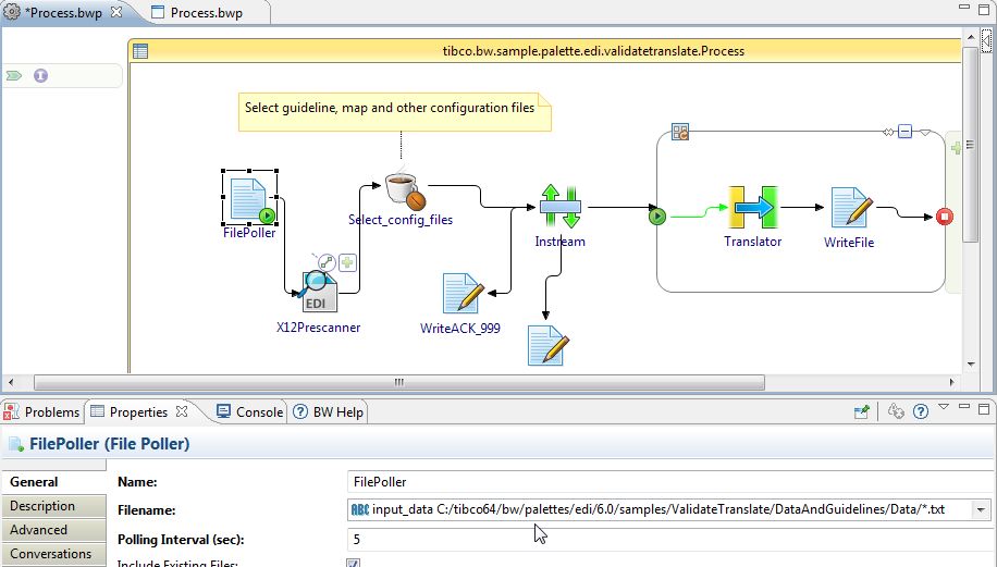 2. Check the file path. In this example the FilePoller activity is set to pick up the input file at the following path <BW_HOME>\samples\palette\edi\x.x\samples\ValidateTranslate/DataAndGuidelines/Data/*.txt. You may need to alter the file path if you have saved the samples to a different location.