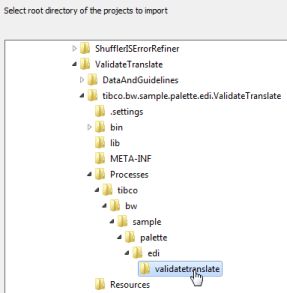 - Check the file path. In this example the FilePoller activity is set to pick up the input file at the following path <BW_HOME>\samples\palette\edi\x.x\samples\ValidateTranslate/DataAndGuidelines/Data/*.txt. You may need to alter the file path if you have saved the samples to a different location.