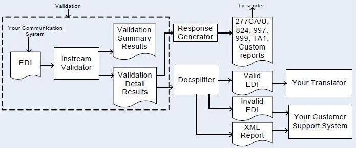 After validation, the Document Splitter function can be used to split data into two types: valid and invalid. For example, Docsplitter can sift out invalid claims in an 837 so that you can process the valid ones and notify the sender of the invalid ones.