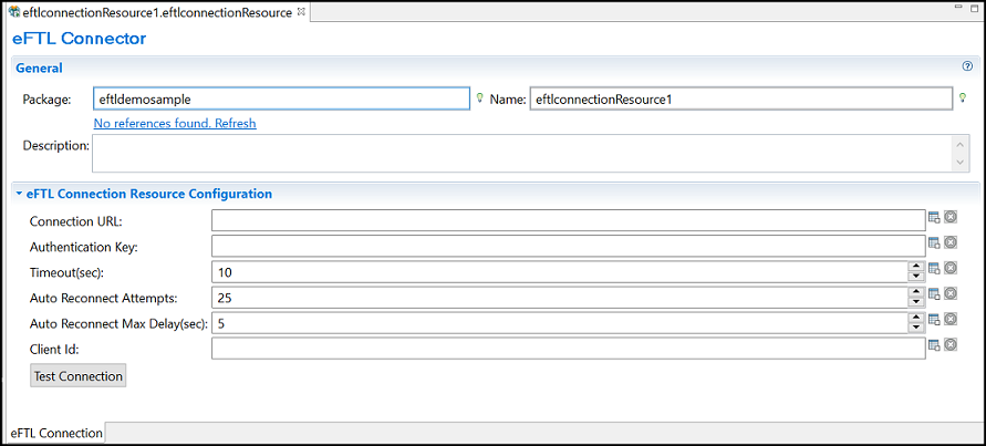New > eFTL Connection to open the eFTL Connection wizard. The resource folder, package name, and resource name of the eFTL connection are provided by default, and can be customized.