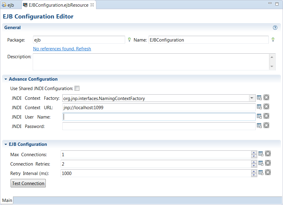 5. Click Test Connection to verify the configuration, as described in EJB Configuration Shared Resource.