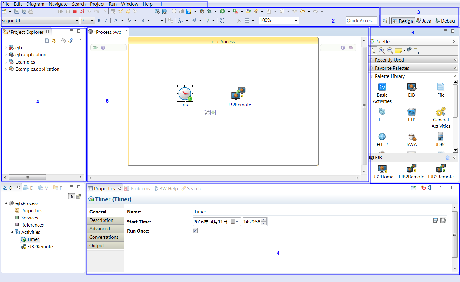 - Palette: contains a set of widgets and a palette library. A palette groups activities that perform similar tasks, and provides quick access to activities when configuring a process.
