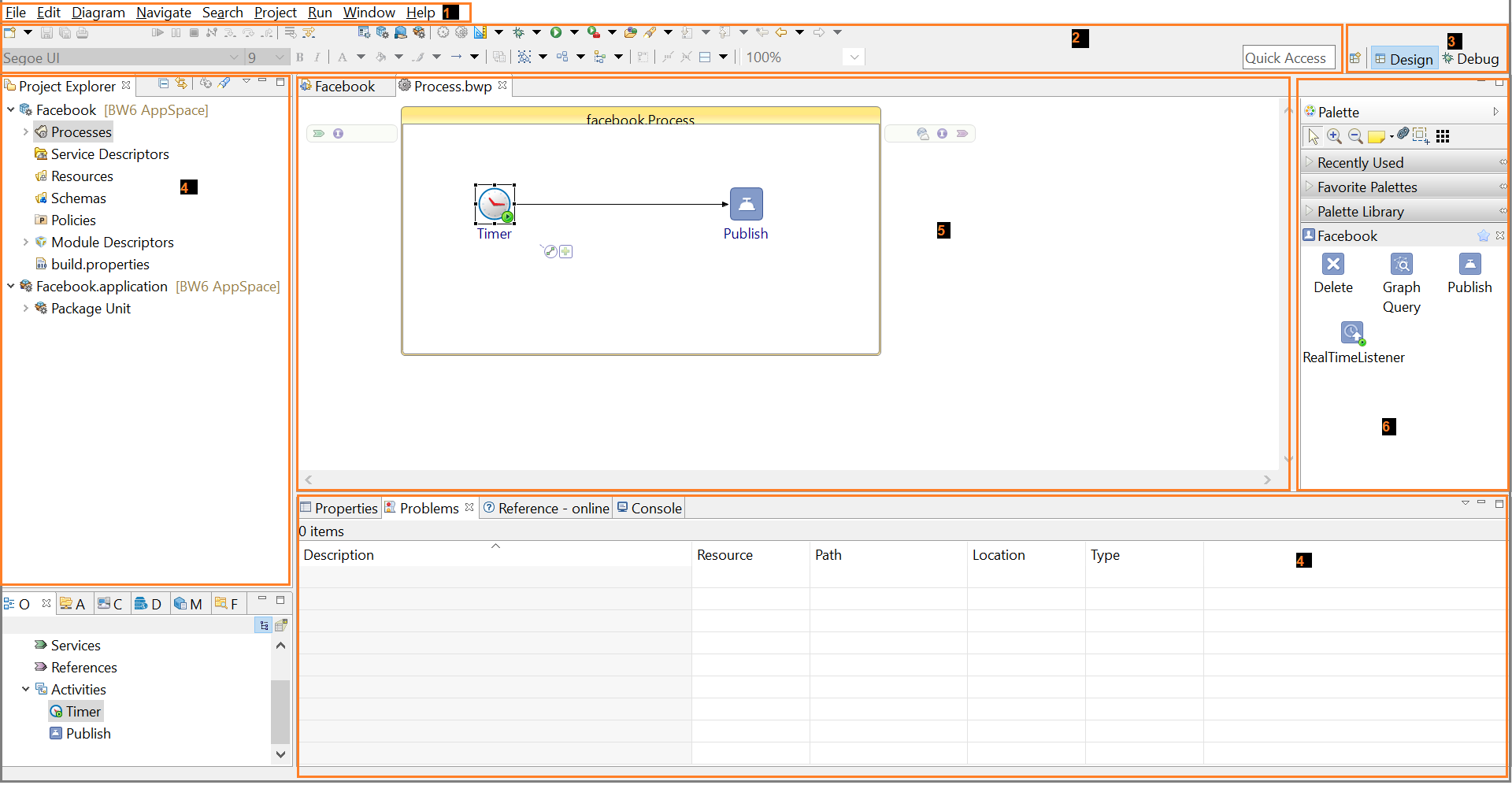 - Editor: provides a canvas to configure, edit, or browse a resource. Double-click a resource in a view to open the appropriate editor for the selected resource. For example, double-click an ActiveMatrix BusinessWorks process (Process.bwp) in the Project Explorer view to open the process in the editor.