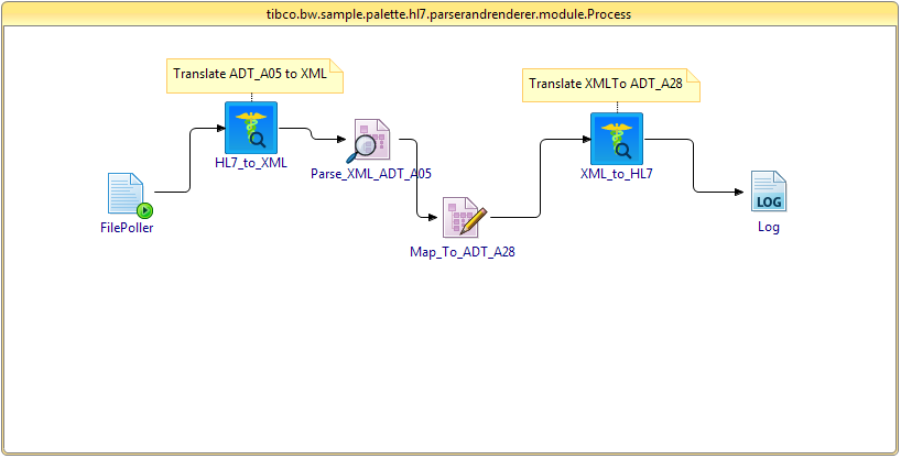 The ParserAndRenderer example shows how to translate input data from one data format to another data format using parsing. In this case, the ADT_AO5.hl7 data is transformed into ADT_A28.hl7 data using the TranslateHL7 activity to map and translate data.