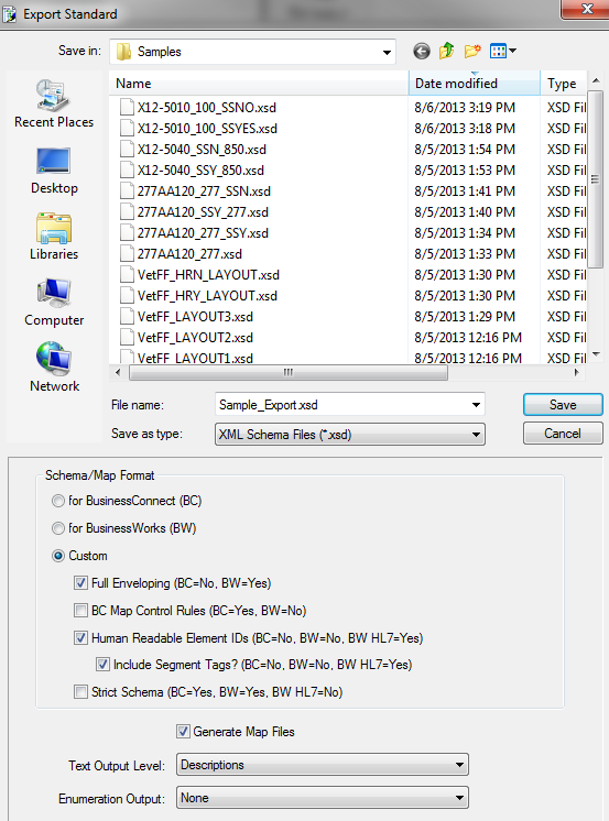 c. In the Schema/Map Format panel, select the Custom radio button and then check the Full Enveloping (BC=No, BW=Yes) , Human Readable Element IDs (BC=No, BW=No, BW HL7=Yes) , and Include Segment Tags checkboxes.