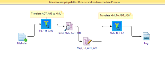 The ParserAndRenderer example shows how to translate input data from one data format to another data format by using parsing. In this case, the ADT_AO5.hl7 data is transformed into ADT_A28.hl7 data by using the TranslateHL7 activity to map and translate data.