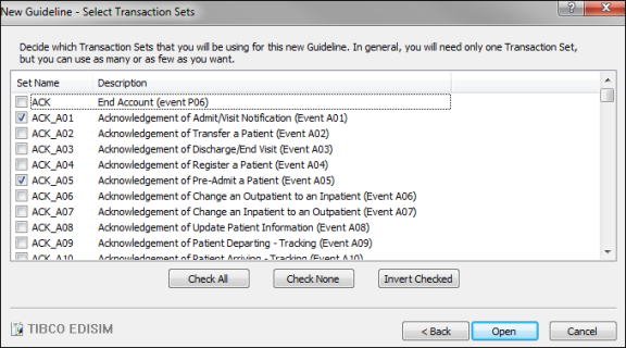 - Click Next. The New Guideline - Select Transaction Sets dialog box opens.