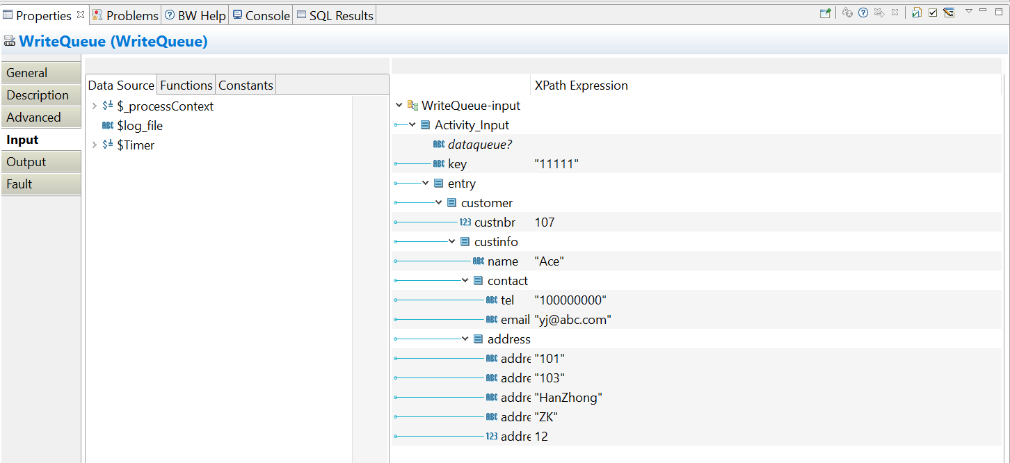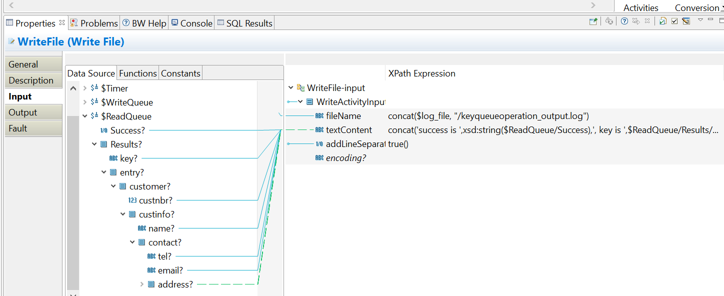 Input tab of the WriteFile activity, construct a message to be written to a file based on the output of the ReadQueue activity.