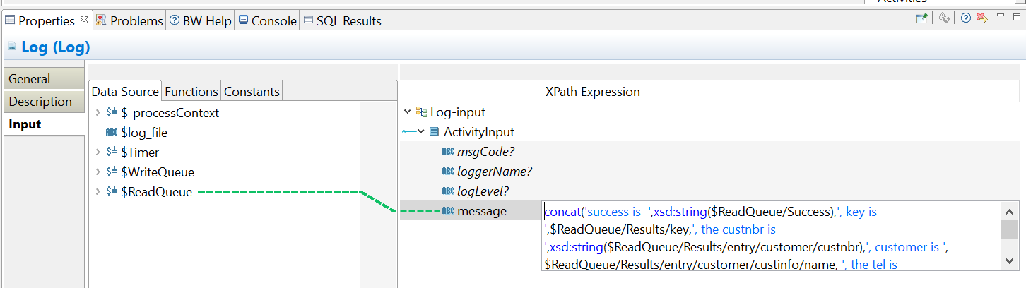 Input tab of the Log activity, construct a message to be logged based on the output of the ReadQueue activity.