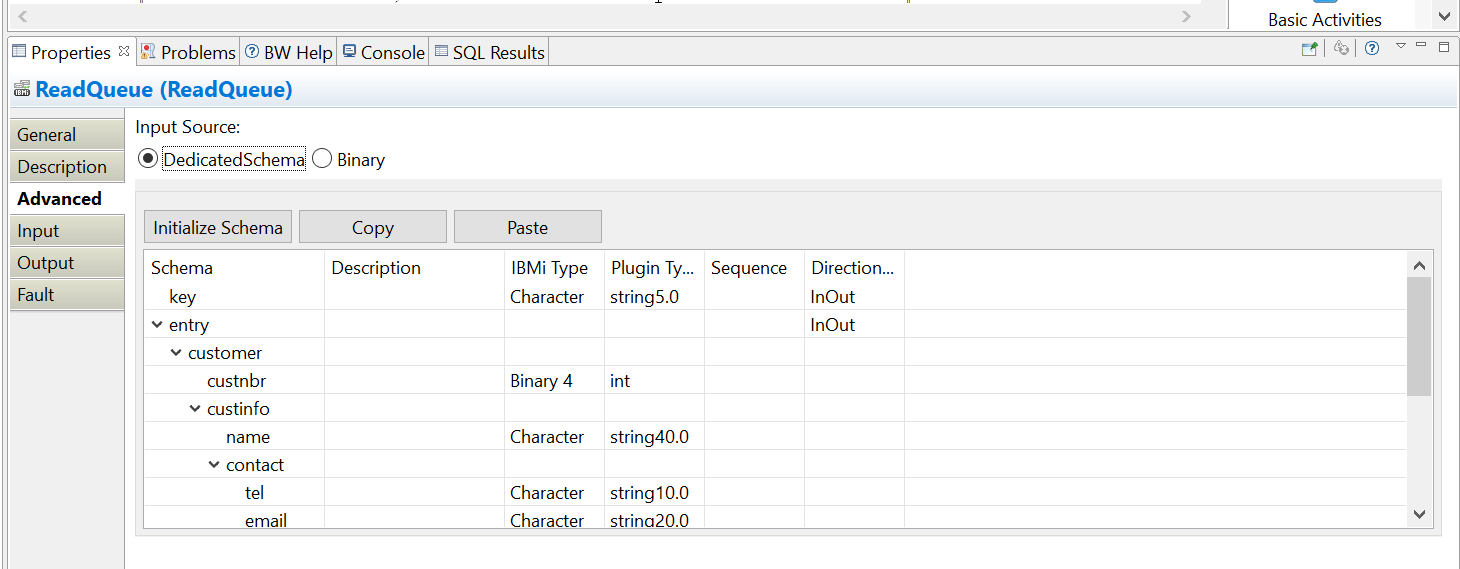 Advanced tab of the ReadQueue activity, add the Schema details for the input message of the data queue.
