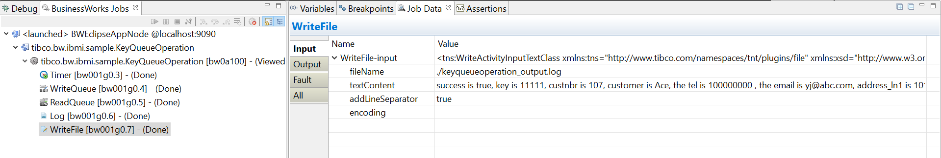 Input tab of the WriteQueue activity, populate the key value along with the other input fields. Since the data queue is defined with a key length of 5, the value entered is 11111.