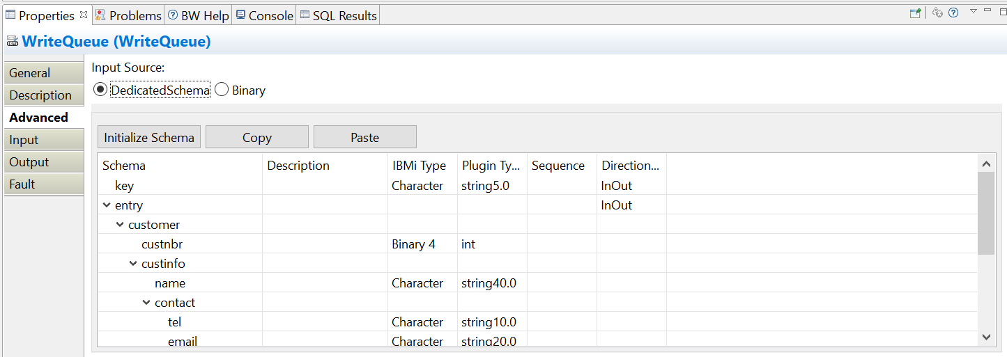 Advanced tab of the WriteQueue activity, add the Schema details for the input message of the data queue.