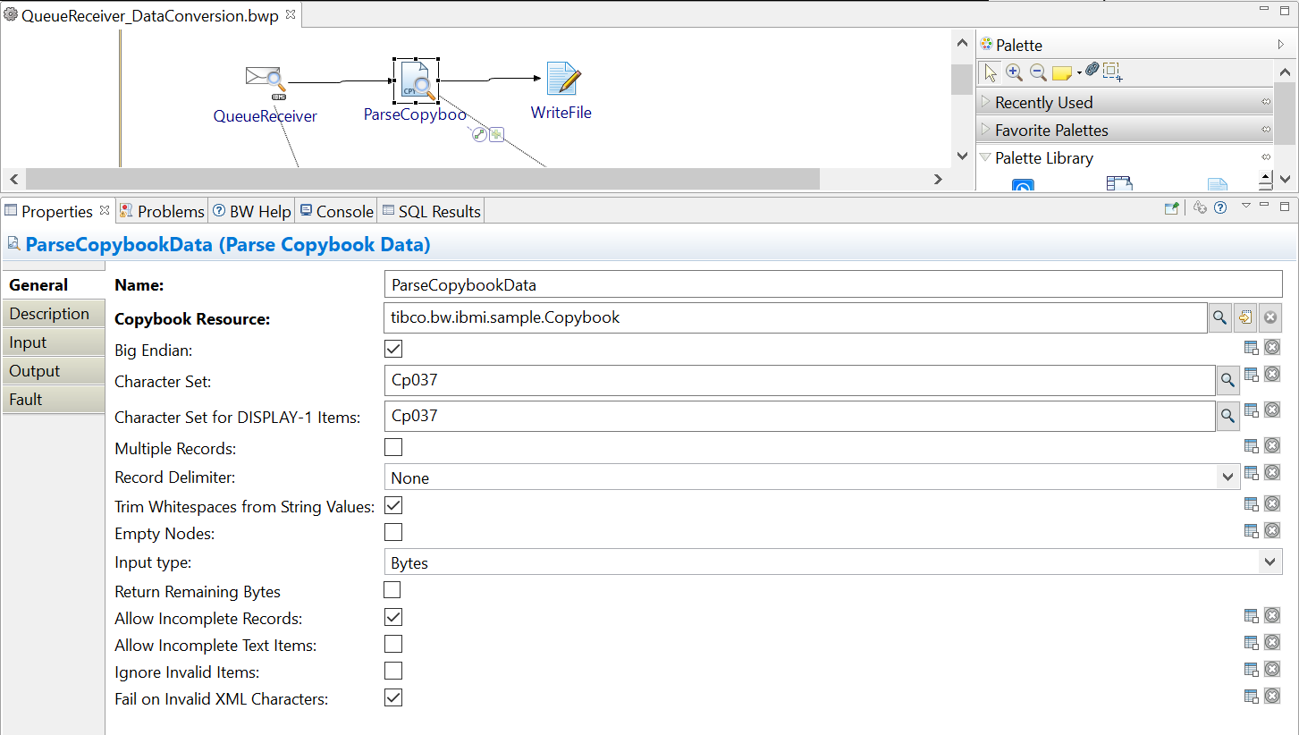The sample process uses the QueueReceiver activity to read messages from an IBM i data queue in binary format, and then uses a Data Conversion Plugin (DCP) ParseCopybookData activity to convert the binary message to XML. Strings within the binary message are assumed to be in the character set specified in the properties of the ParseCopybookData activity.