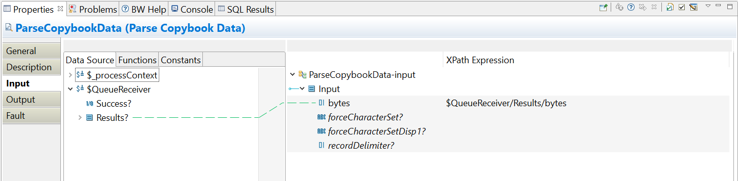 Input tab, pass the QueueReceiver message as input to the ParseCopybookData activity, in bytes.