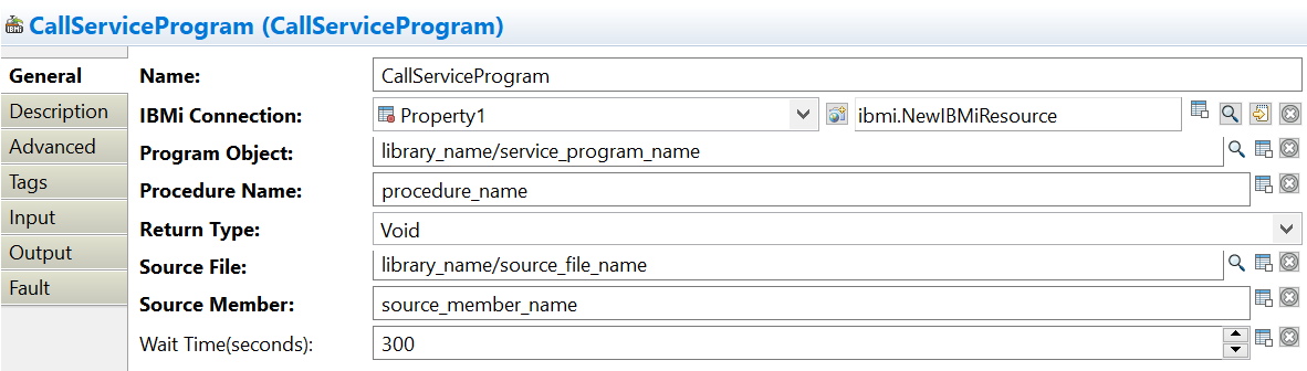 | Wait Time (seconds) | Yes | Yes | Specify a time interval to wait for the completion of a service program object invocation.