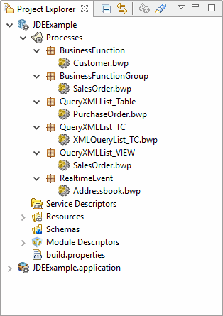 After importing the sample project, expand the project in the Project Explorer view. All the processes are displayed. See Importing the Sample Project for more information.