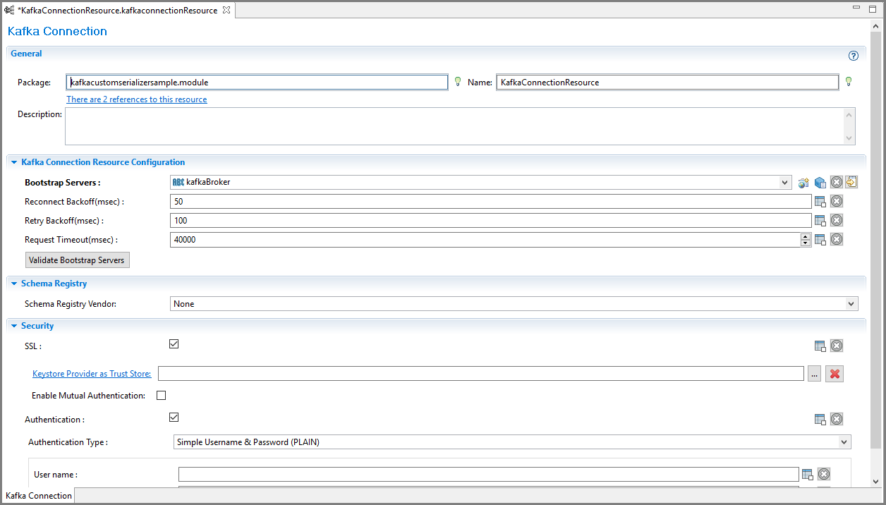 New > Kafka Connection to open the Kafka Connection wizard. The resource folder, package name, and resource name of the Kafka connection are provided by default, which can be customized.