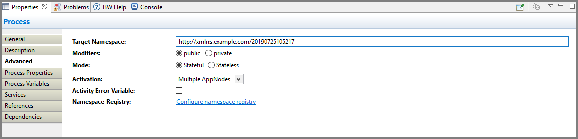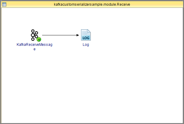 The Receive.bwp process demonstrates how custom deserializer is added to the Receive activity to deserialize the message. On the Advanced tab in the Properties field a value.deserializer property is configured as an additional property. This property lets the Receive activity use a class for deserializing the message. For example, Google Protocol Buffer is used to deserialize the message from a byte data to a Person objects (defined in the PersonProtos.java file in the src folder) JSON representation.