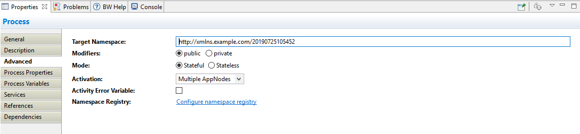 The Receive.bwp process demonstrates how a custom deserializer is added to the Receive activity to deserialize the message. On the Advanced tab in the Properties field a value.deserializer property is configured as an additional property. This property lets the Receive activity use a class for deserializing the message. For example, Google Protocol Buffer is used to deserialize the message from a byte data to a Person objects (defined in the PersonProtos.java file in the src folder) JSON representation.