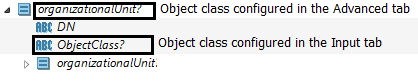 The configured object class refers to the object class that you select from the Advanced tab or the object class specified in the Input tab. The object class specified in the Input tab can overwrite the object class specified in the Advanced tab. The objectClass attribute is one attribute of the specified object class. |