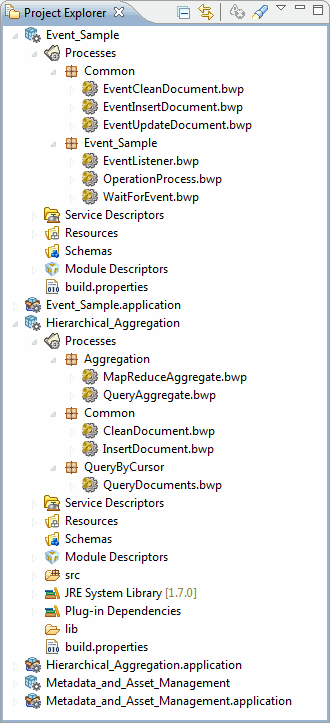After importing the sample projects, expand all projects in the Project Explorer view. All the processes are displayed. See Importing the Sample Projects for more information.