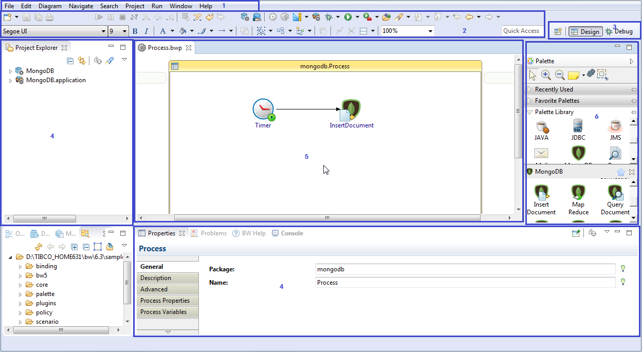- Editor: provides a canvas to configure, edit, or browse a resource. Double-click a resource in a view to open the appropriate editor for the selected resource. For example, double-click an ActiveMatrix BusinessWorks process (MortgageAppConsumer.bwp) in the Project Explorer view to open the process in the editor.