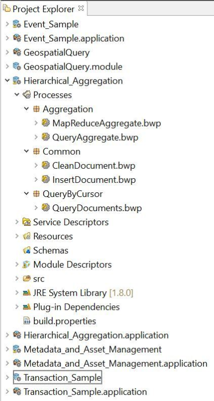 After importing the sample projects, expand all projects in the Project Explorer view. All the processes are displayed. See Importing the Sample Projects for more information.