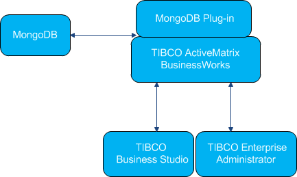- TIBCO ActiveMatrix BusinessWorks Plug-in for MongoDB is plugged into TIBCO ActiveMatrix BusinessWorks™ and is connected to MongoDB.