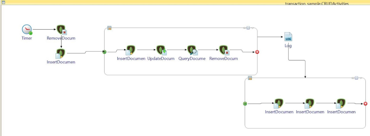 - In the second Local Transaction Group, three InsertDocument activities participate in a transaction but the transaction is aborted due to an exception thrown from within the transaction group.